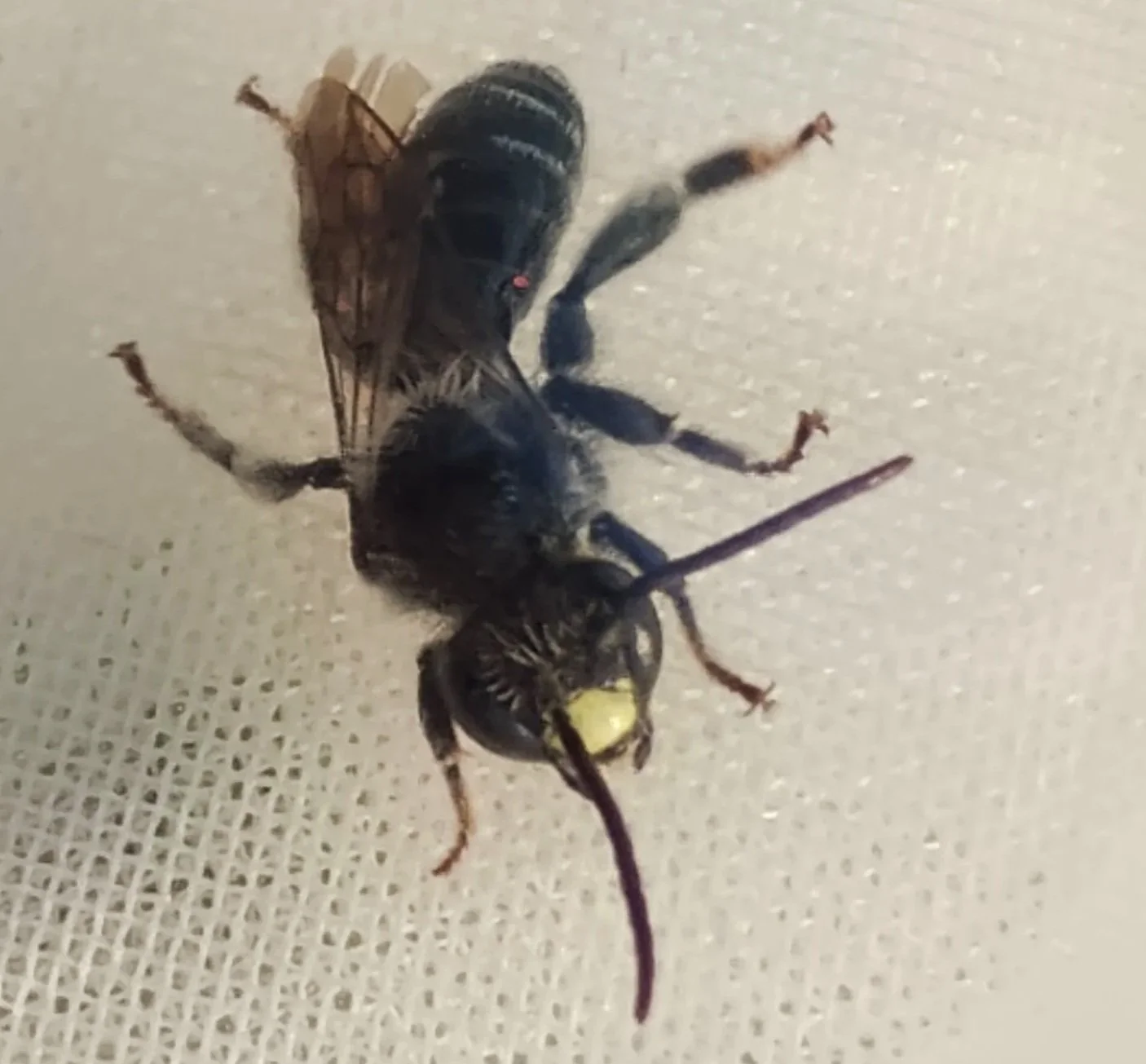 That adjustment made all the difference. The bee itself wasn’t immediately obvious. Like many small, black solitary bees, it had to be pinned, labelled, and examined under a microscope to get an identification—but once Lisa saw it, she knew.